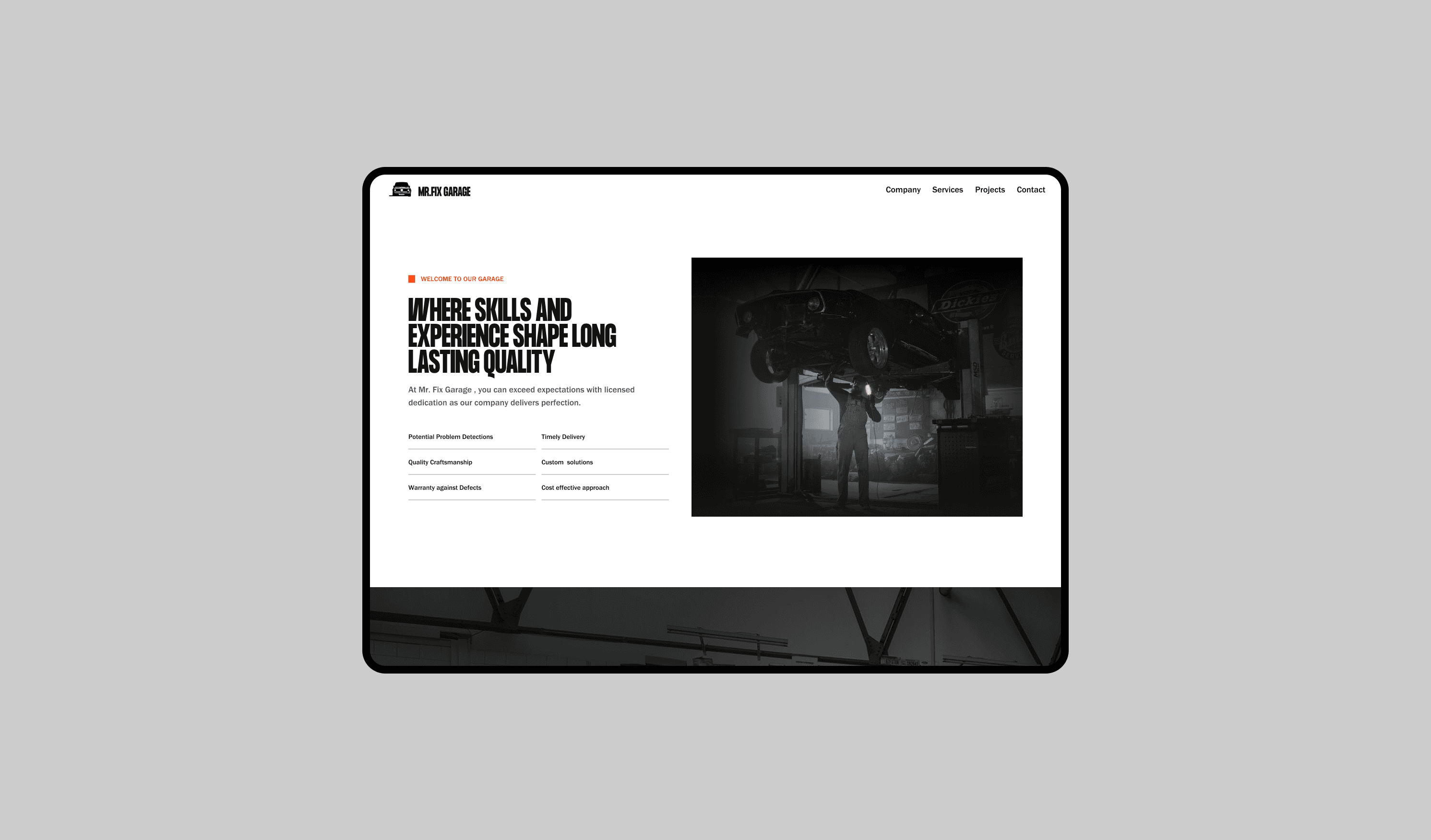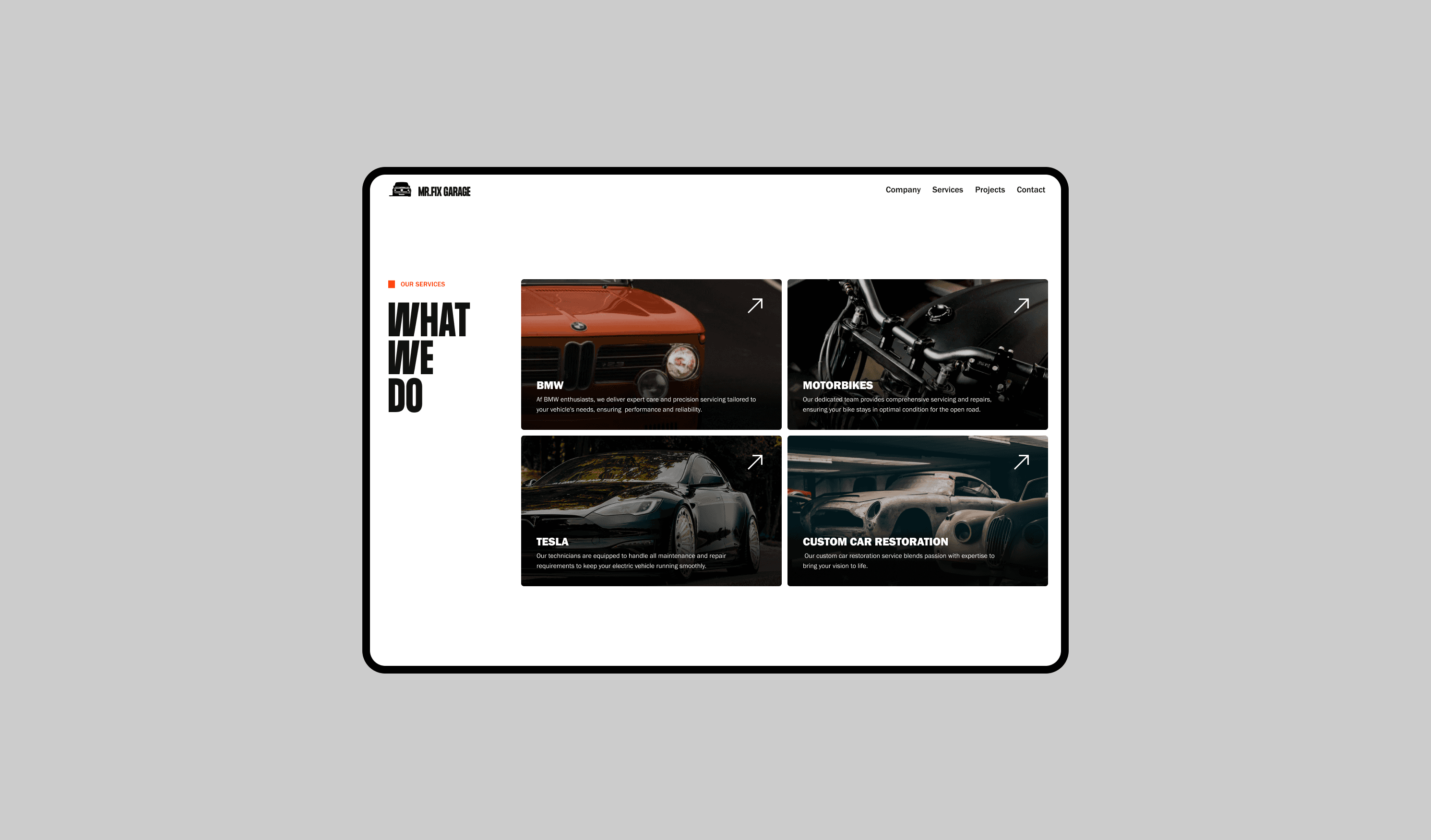 MR.Fix is a car repair service in Finland, with a website design that emphasizes user-friendly navigation, sleek layout, and a modern aesthetic. Clean lines, intuitive menus, and bold typography ensure easy access to services, while a streamlined interface and dynamic visuals convey trust and professionalism. The design balances functionality with style, making it effortless for users to book services and learn about MR.Fix’s offerings
